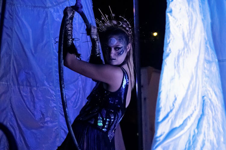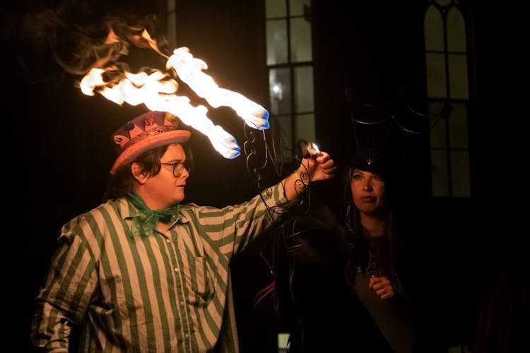 He said some students began training for this play two years ago in a circus arts class. The fire acts were coached by the Strange Bedfellows, an act played by Kristin Wright and Jordan Harwood of Milledgeville, Ga. They play in “Circanium” as part of the Astral Flames alongside aerial performer Jessica Lyszczasz.