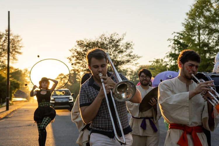 In the parade-like march, performers played up-beat jazz music while a colorful array of characters showed off their costumes and talents like walking on stilts.