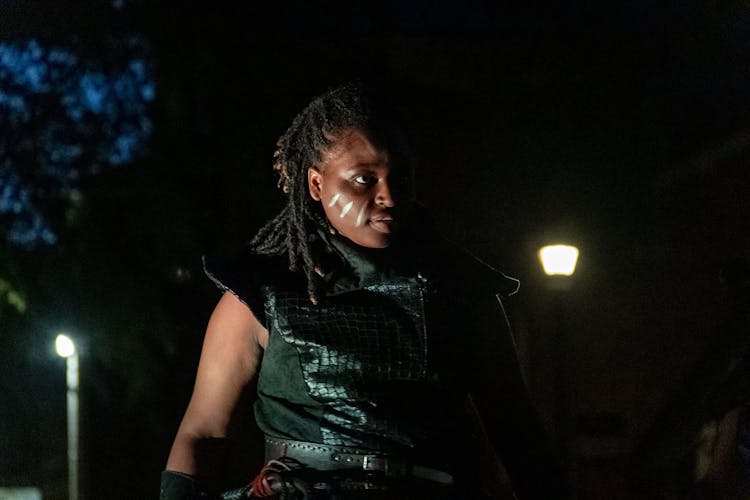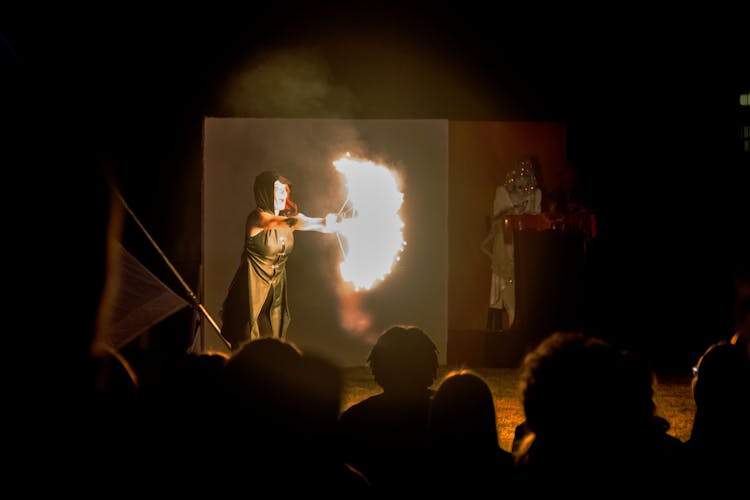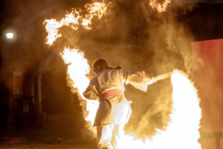 The other characters showed off their skills during a group fire performance with a half-dozen people. Later, two characters fought with flaming swords.